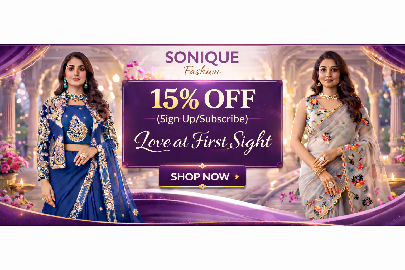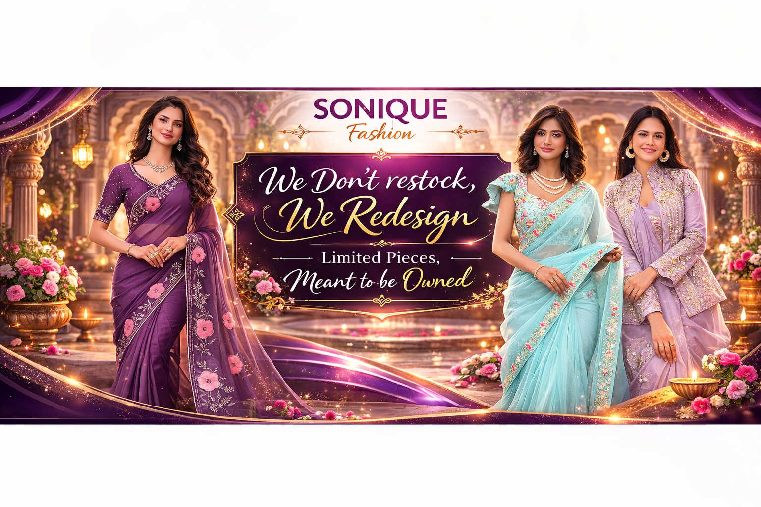 Step into luxury with the most coveted styles at SONIQUE Fashion. Our featured collection brings you exclusive designer sarees, premium salwar suits, and statement ethnic wear crafted for weddings, festive celebrations, and unforgettable evenings.